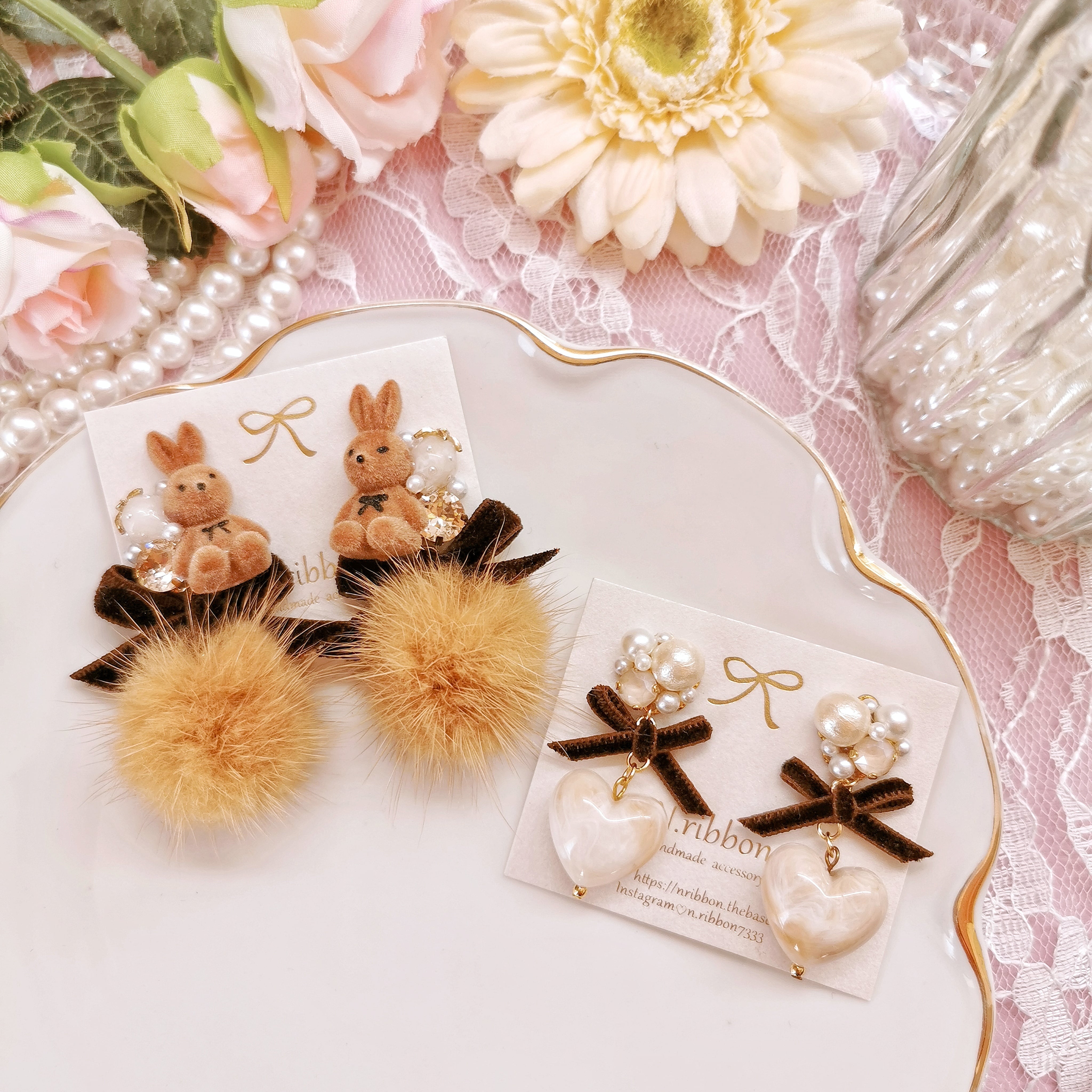 《 ラビットビジュー×ベロアリボンミンクファー 》 ピアス