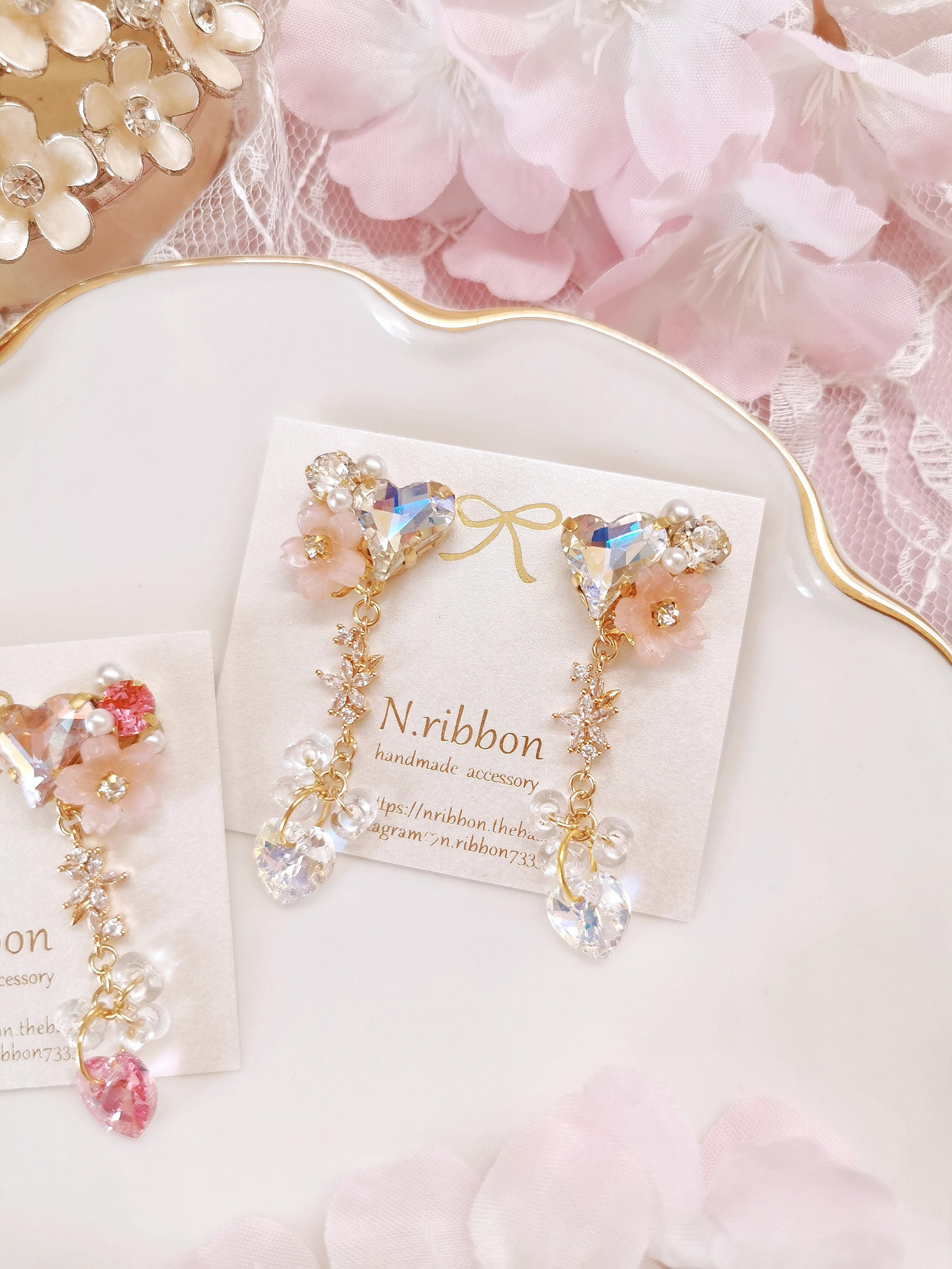 《桜ハートビジュー×ハートスワロフスキーチャーム》ピアス/イヤリング