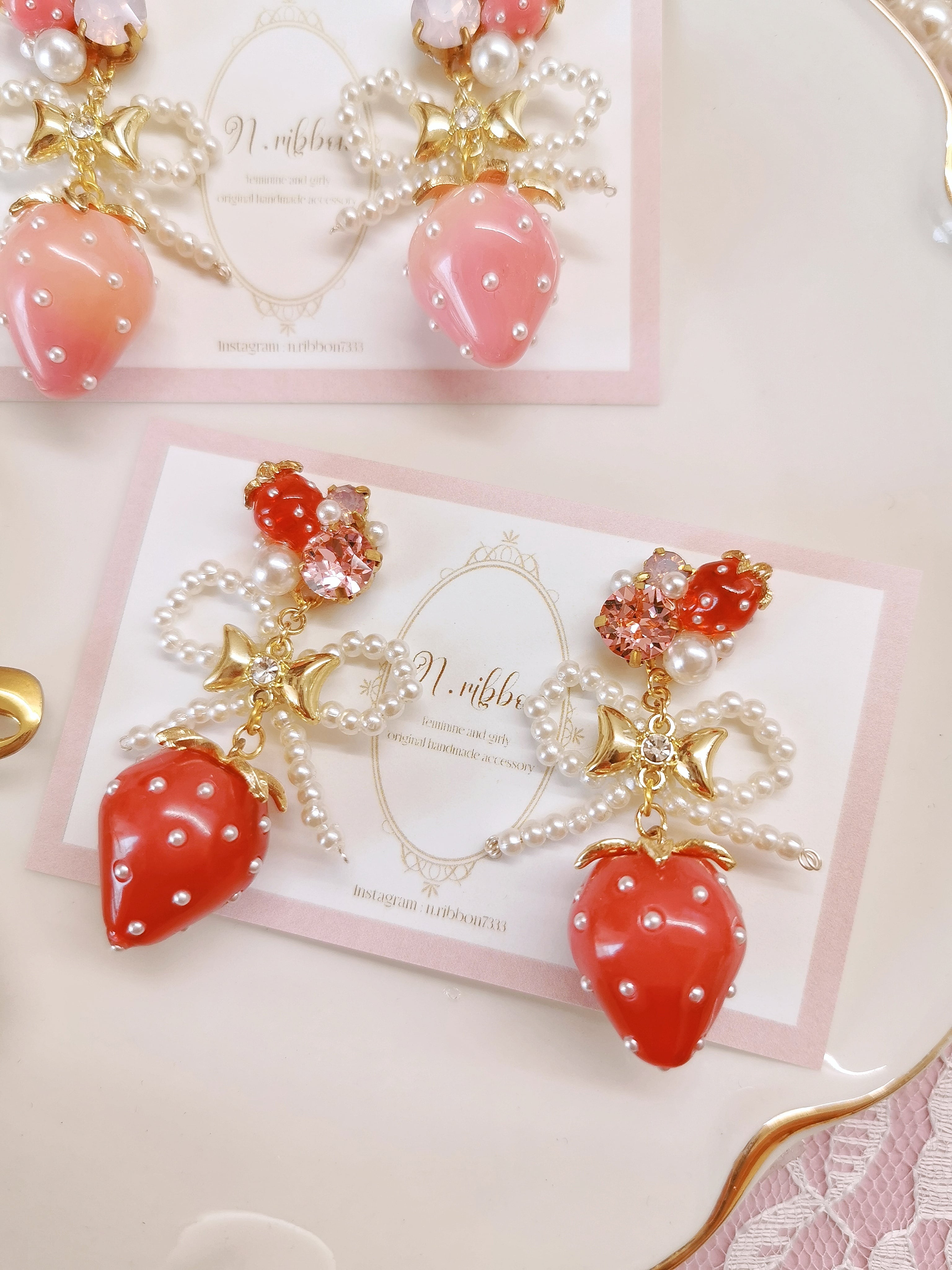 パールで作ったリボンチャームはメタルリボンも重ね合わせており、細部までこだわりのあるデザインです✩.*˚