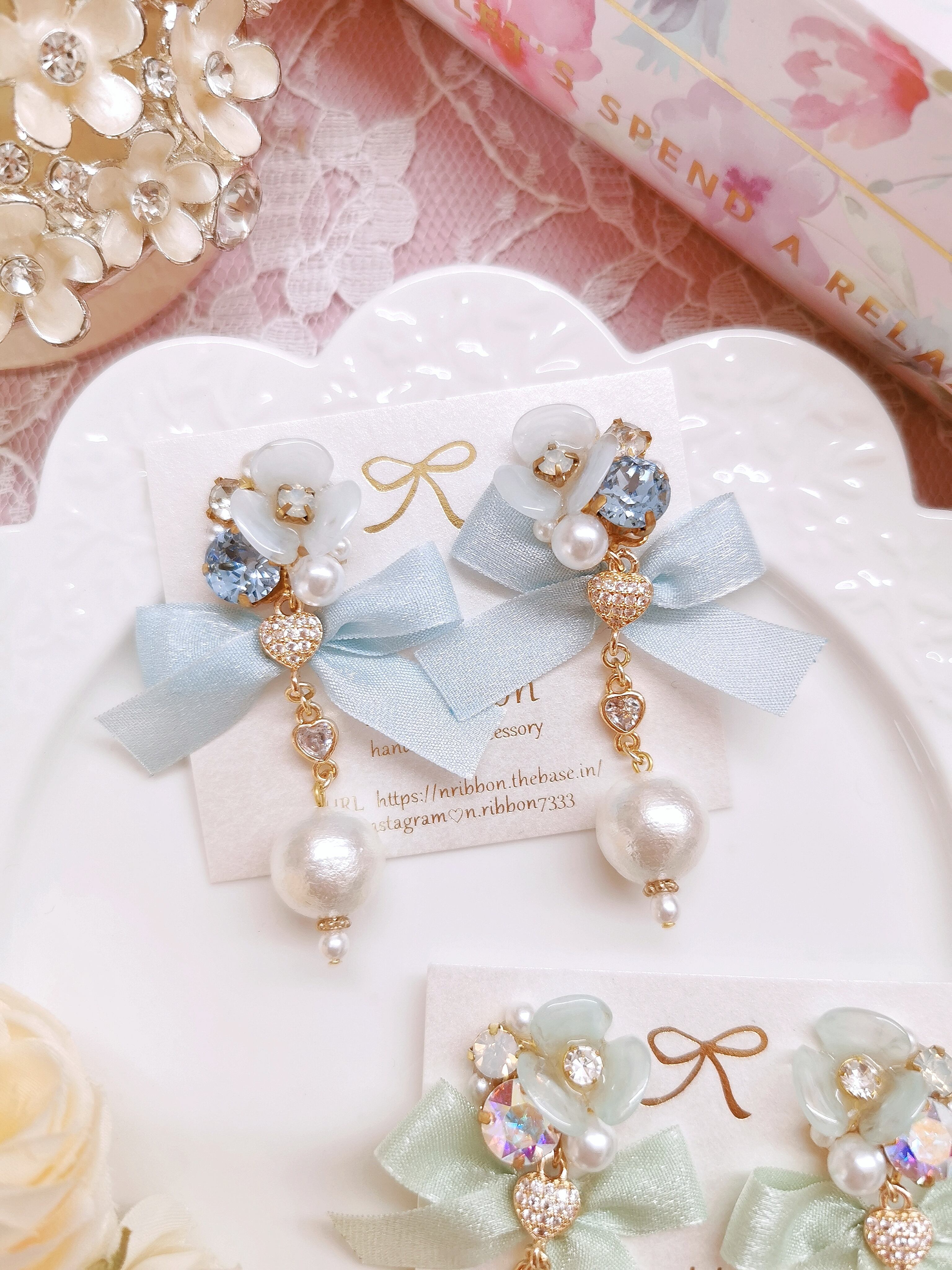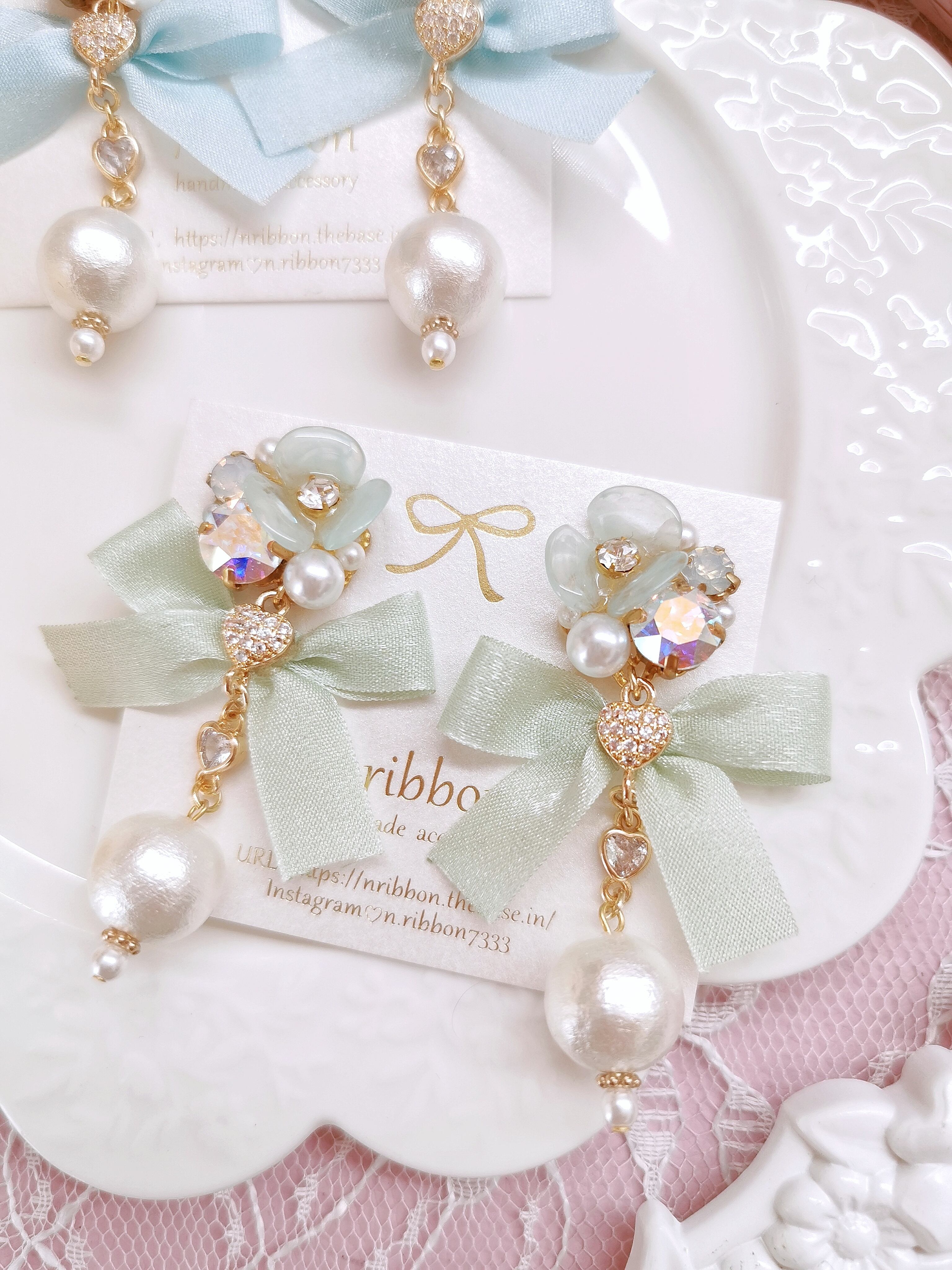 《ふんわりリボンとパステルフラワービジュー》ピアス/イヤリングピアス/イヤリング