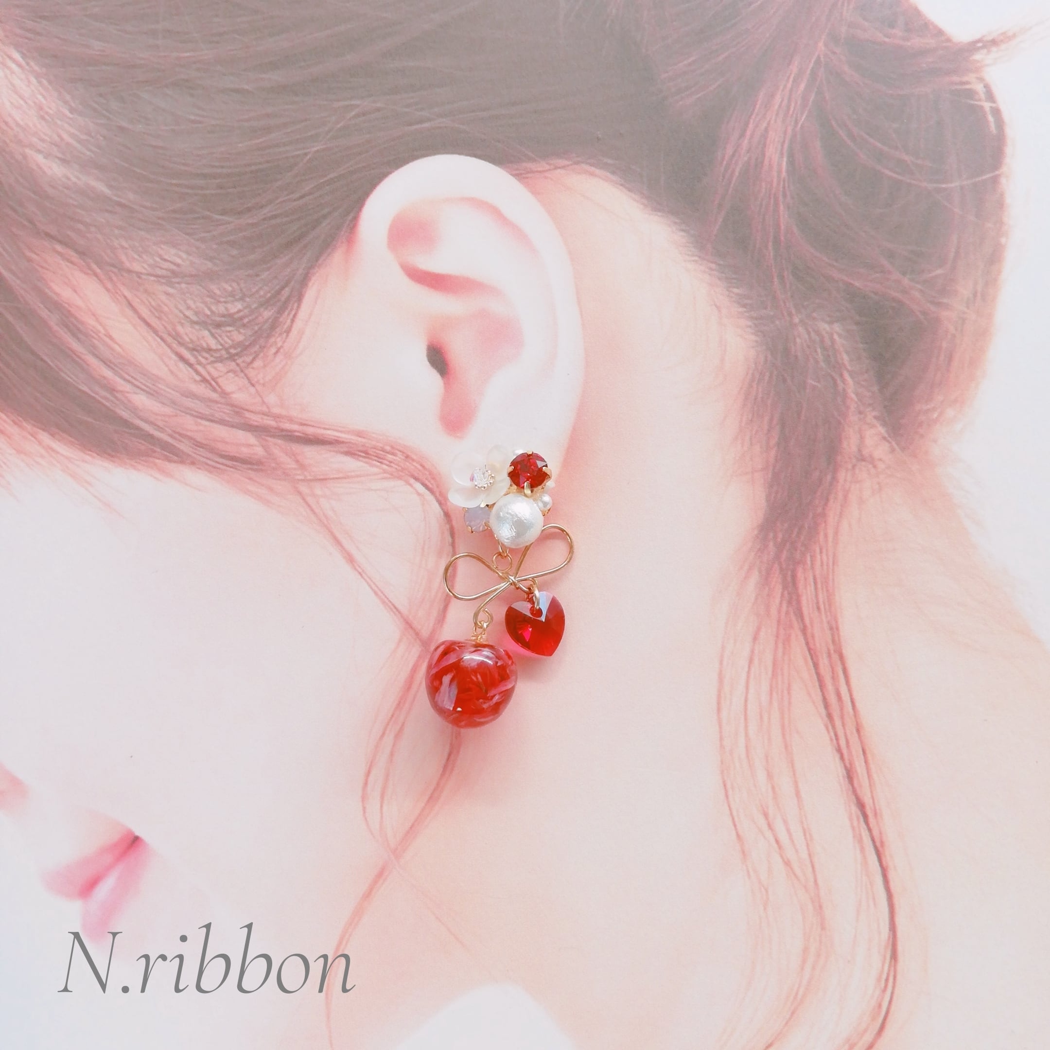 《 Natural flower × Swarovski heart cherry 》 ナチュラルフラワー×スワロフスキーハート チェリー ピアス/イヤリング