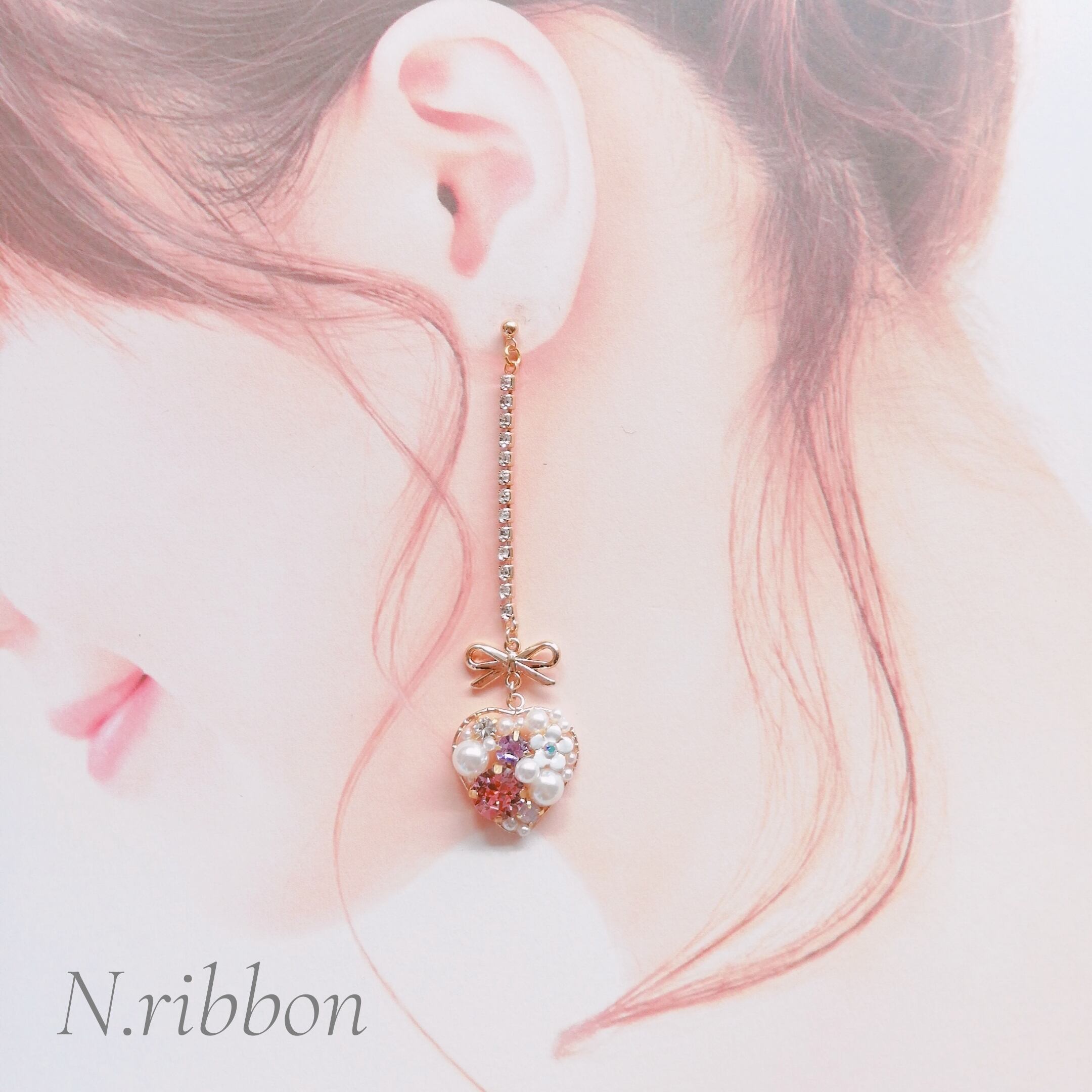 スワロフスキーやお花パーツ、パールをたっぷりと詰め込んだハートビジューがゆらゆらと揺れるエレガントなデザイン✩.*˚