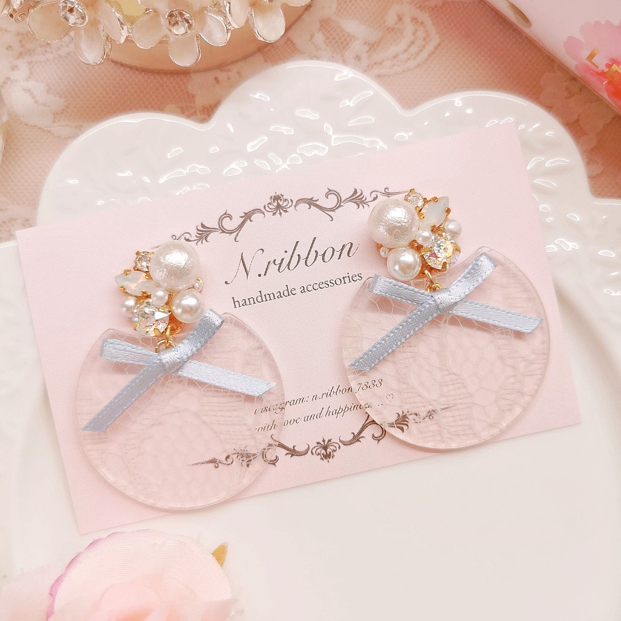 ホワイトのレースチャームとライトブルーのサテンリボンを合わせて、品よく仕上げました…ꕤ*.゚